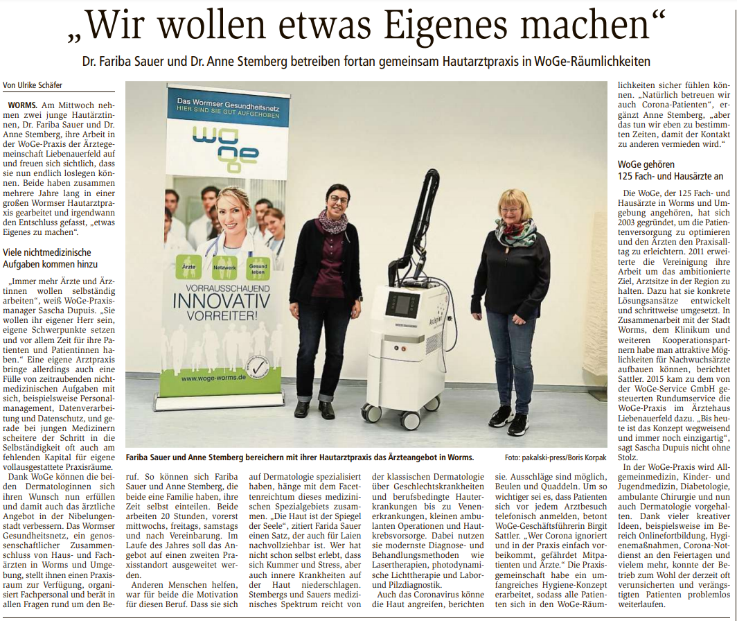 Artikel "Wir wollen etwas eigenes machen" - Dermatologie in der Ärztegemeinschaft Liebenauerfeld, Wormser Zeitung v. 05.01.2021